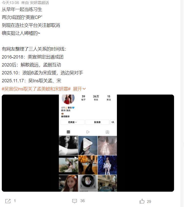 这样的事情发生,引起粉丝们的不满,看到“吴宣仪ins取关了孟美岐和宋妍霏”话题登上热搜,有网友忍不住问:都是表面关系吗?《创造101》的时候,孟美岐和吴宣仪确实是同公司艺人,但火箭少女101解散之后,她们就开始各自发展。